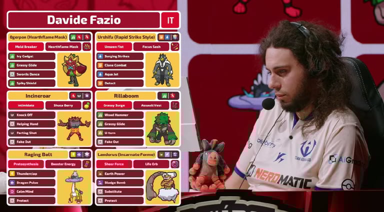 Il nostro Davide si congeda dalla Teracristallizzazione pescando a piene mani dalla top usage e con il suo tocco d’artista che merita, anche alla luce del suo traguardo, un suo focus. Potremmo usare una classica musicale e dialettica per riassumere il suo team: toccata e fuga. Complice la batteria che fedelmente lo accompagna, è Rillaboom a dettare i tempi indossando anche il Corpetto Assalto: settando il Campo Erboso si garantisce la priority di Erboscivolata (ad appannaggio anche di Ogerpon), per poi elargire “carezze” con Bruciapelo e Mazzuolegno; Retromarcia è per ritirate strategiche utili a resettare le carte sul tavolo di gioco (ogni riferimento a Indeedee non è puramente casuale).